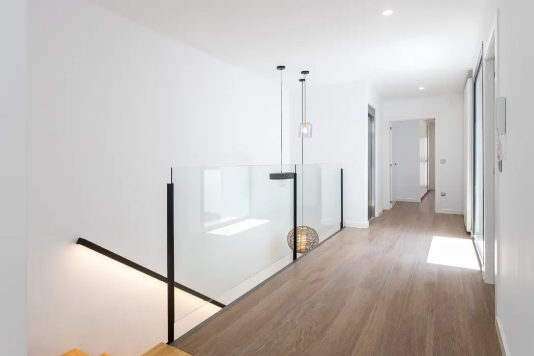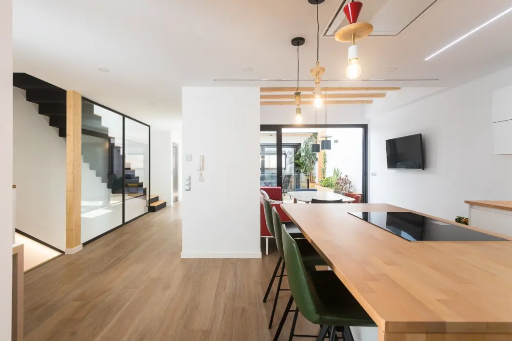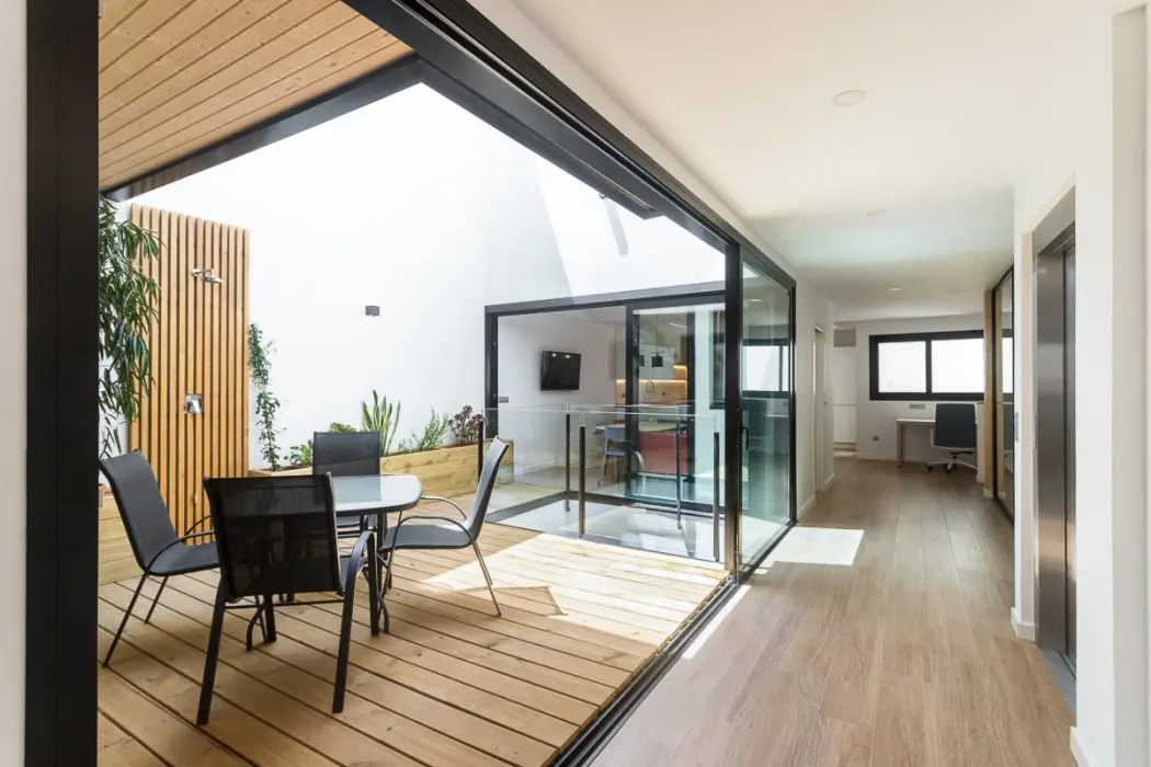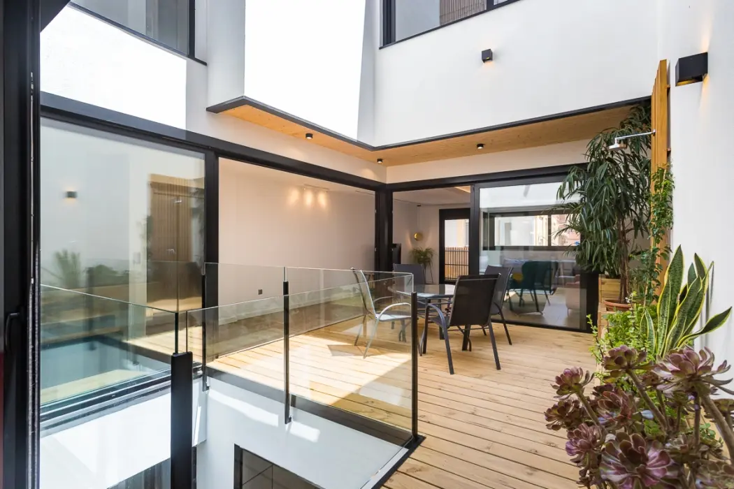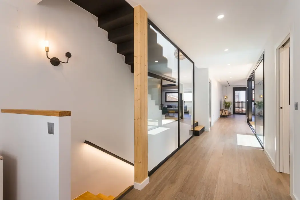 Vivienda de 300 m2 en tres plantas entre medianeras con un diseño exterior moderno que combina la cerámica blanca con detalles de madera muy típicos nuestros. La distribución esta pensada para hacer vida en torno a su patio central. Esta vivienda tiene cuatro dormitorios dobles y cuatros baños completos.