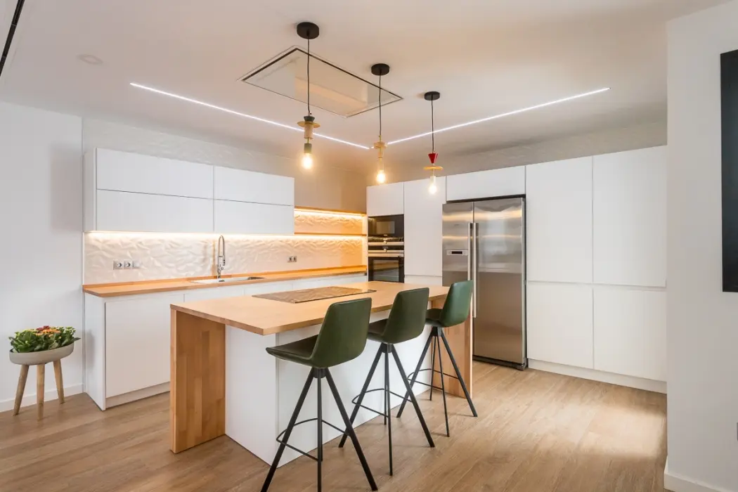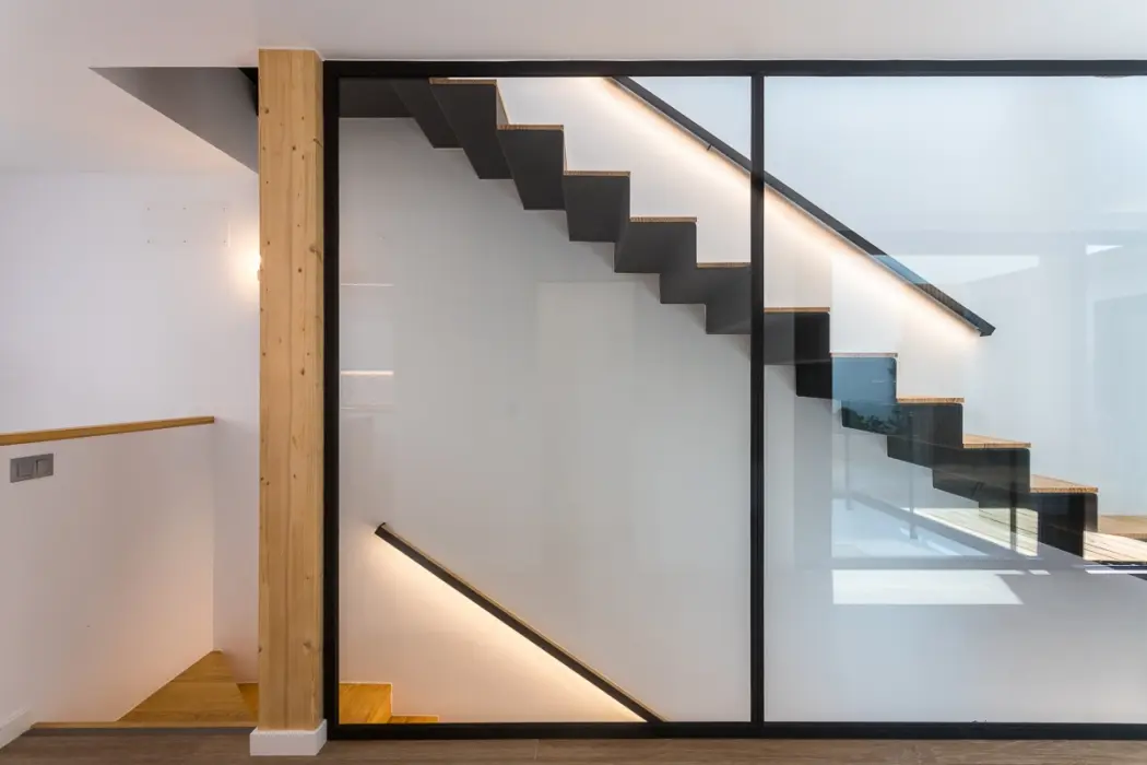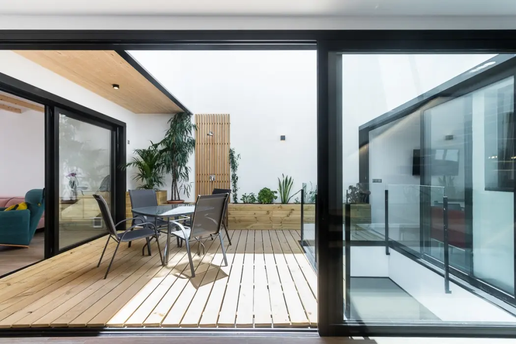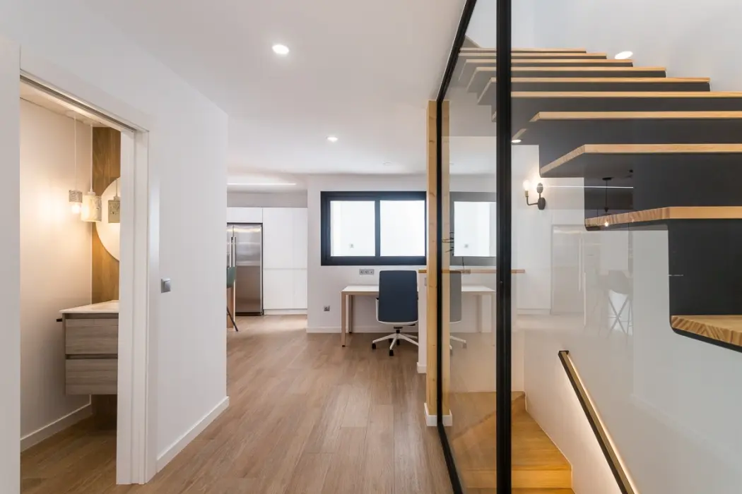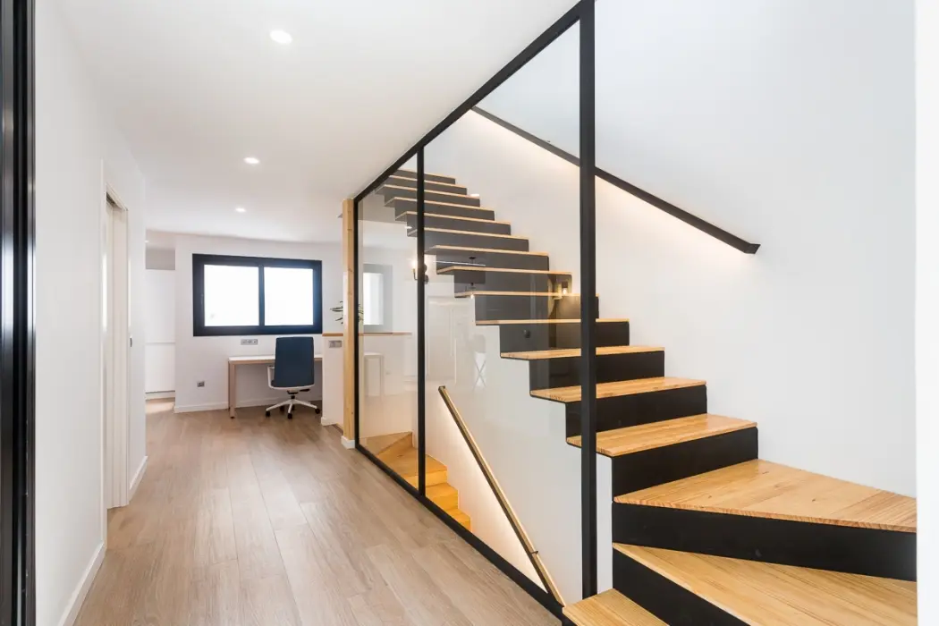 Vivienda de 300 m2 en tres plantas entre medianeras con un diseño exterior moderno que combina la cerámica blanca con detalles de madera muy típicos nuestros. La distribución esta pensada para hacer vida en torno a su patio central. Esta vivienda tiene cuatro dormitorios dobles y cuatros baños completos.
